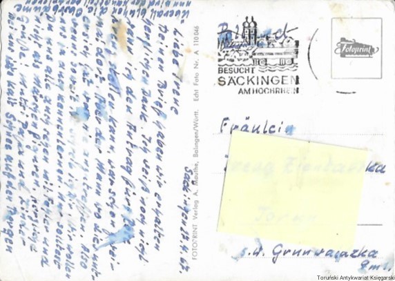 Pocztówka jest w dobrym stanie, jest zapisana na odwrocie, ma karbowane krawędzie, jest przetarta na brzegach.